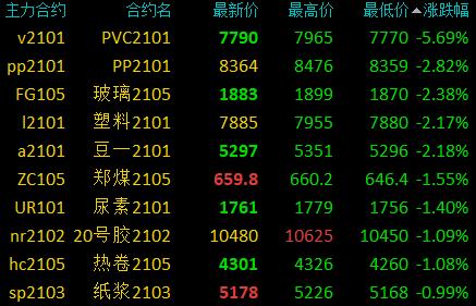 12月15日讯 国内期货市场开盘,商品期货多数下跌,能源化工领跌,PVC跌超5%,玻璃、PP等跌超2%,塑料、热卷等跌超1%,铁矿、焦炭等小幅下跌;纯碱、沪锡涨逾1%,鸡蛋、棕榈、豆油等小幅上涨。