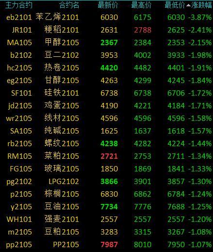 国内商品期货开盘:多数下跌,苯乙烯、乙二醇跌超2%