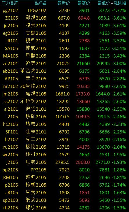 12月29日讯 国内期货市场收盘,商品期货普遍下跌,LPG、硅铁跌超4%,纯碱、郑醇、郑煤等跌超3%,热卷、焦炭等跌逾2%,豆粕、豆油等跌超1%,PTA、沥青等小幅下跌;仅红枣、燃油等少数品种收涨。