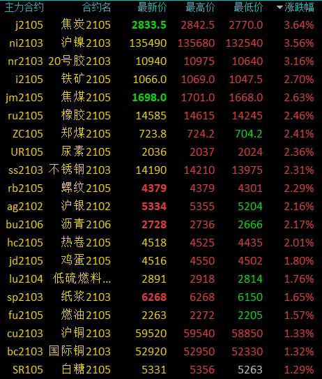 1月15日消息 国内期货市场开盘,商品期货多数上涨,焦炭涨近3.5%,动力煤、焦煤、不锈钢、铁矿、螺纹、橡胶、郑煤涨超2%。生猪、乙二醇、苹果跌超1%。