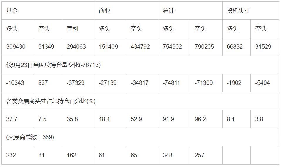 截止9月30日当周COX(纽约商品期货交易所)黄金期货和期权分类持仓报告: 合约单位:(100金衡盎司的合同)总持仓量:821734