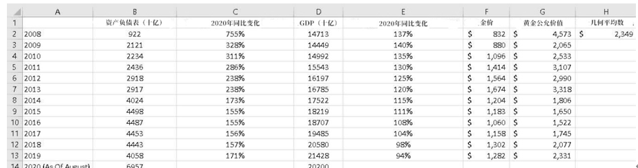 黄金的公允价值将与资产负债表中增加的货币成比例上升,但这一涨幅有时候会被GDP的增长部分抵消。举个例子,如果当年资产负债表和GDP都增长了5%,那么黄金的价值就会保持不变。但是,如果扩表速度大于GDP增长速度,那么黄金的公允价值就会增加。