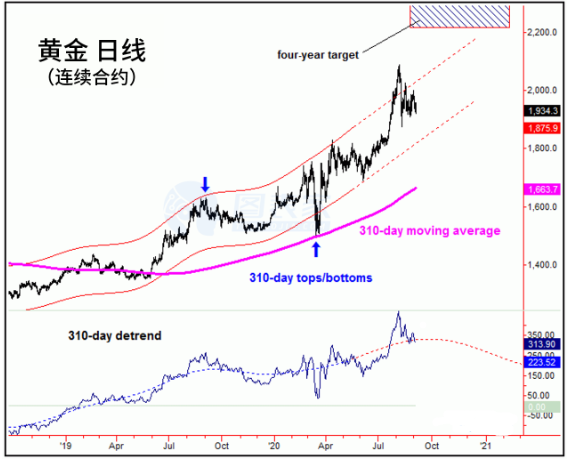 下面的图表显示了更大的310天周期,预计至少在今年10月底的黄金会进一步走高: