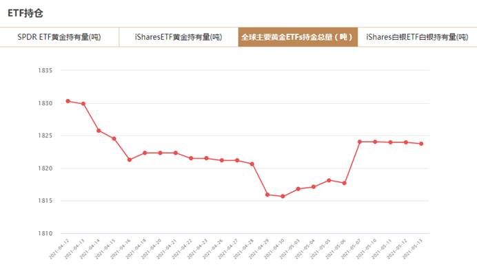 截至2021年5月13日,全球8大黄金ETFs持仓总量为1823.747吨,与上一交易日减少0.21吨。
