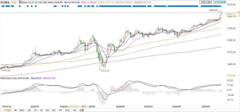 提醒,综合以上情况看,美国的下一份刺激法案可以在8月份才能通过,而非之前预期的7月底,因为两党对此存在分歧。尽管如此,市场普遍预期美国较大概率会推出新一轮刺激计划,这令通胀面临大幅上升的风险,而黄金长期以来都有抵御通货膨胀的属性;再加上资金面的宽松,使得实际利率降低,也降低持有黄金的机会成本;金价站稳1800关口后,持续上涨,目前初步攻克1850关口,可能会进一步向2011年创下的历史高点1911.18位置发起冲击。