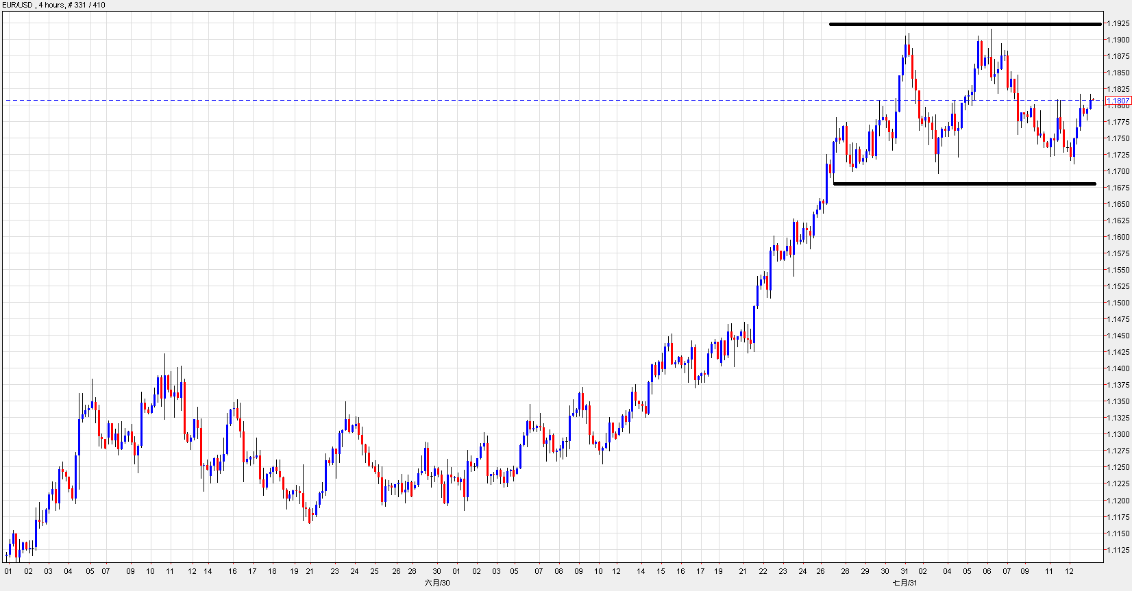 2.欧元兑美元走势4小时图,短线于高位横行整固,区间位于1.17至1.1915,建议短线投资者于区间高沽低买。