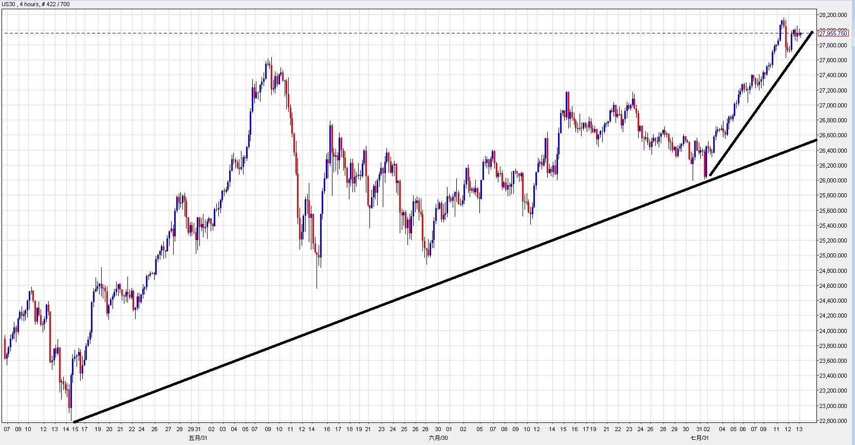 3.US30走势4小时图,由中线上升轨转为斜度更高的短线上升轨,初步目标28265,下一步目标29000点,建议投资者买入。
