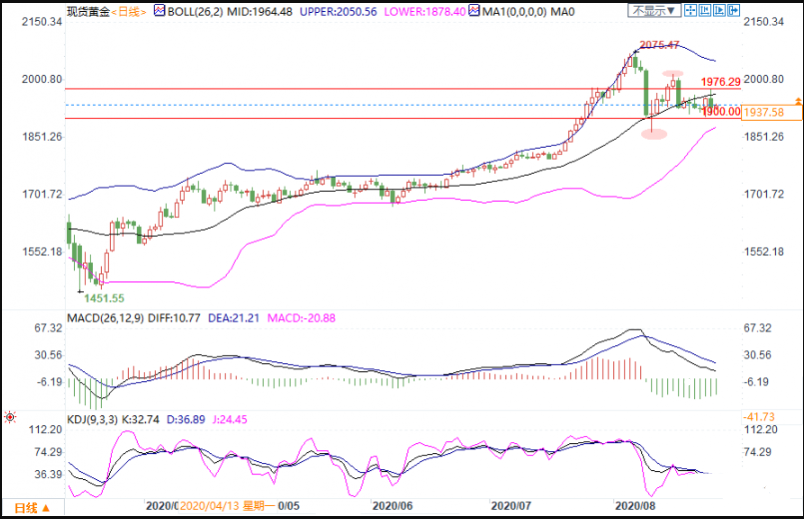 上行方面,先留意布林带上轨1951.97,强阻力上看2000.00关口,这是重要的心理关口。此外,前一交易日触及的高点1976.634附近也有一定阻力,投资者可以简单留意。
