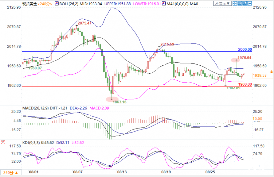 下方初步支撑先留意布林带下轨1916.00附近,强支撑下看1900关口,这是重要心理关口,也与本周触及的低点相近。若跌破将提振市场看空情绪,金价可能回踩8月12日低点1863.16。