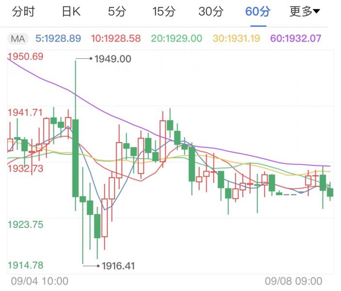 国际现货黄金周二(9月8日)目前短线企稳小阴线下跌走势,黄金价格保持区间内波动,截至目前,黄金暂报1925美元/盎司附近。