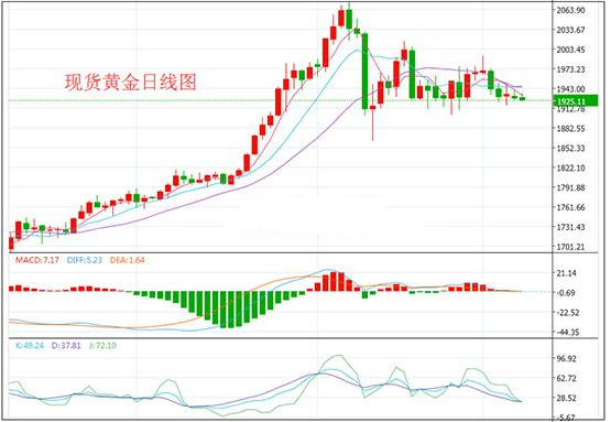 从日线图上看,布林带有拐头向下迹象,金价徘徊中轨与下轨之间。MACD死叉、指数低于10,KDJ死叉、指数位于40下方。从技术面看,黄金偏震荡走低,但预计短线不会跌破1900关口。