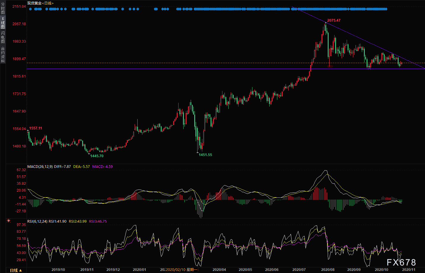关注黄金价格日线图形成的下跌三角形