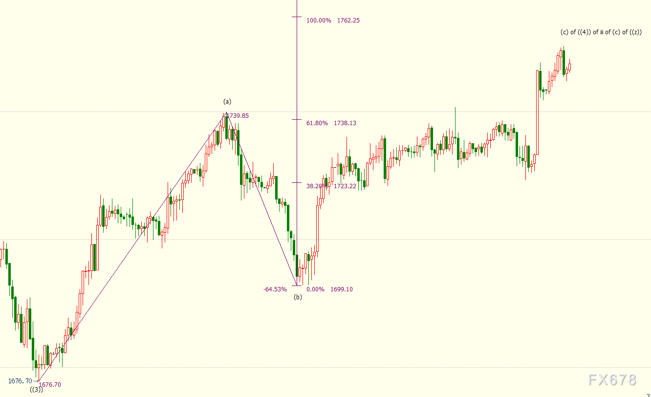 小时图上看,现货黄金处于自1699美元开启的反弹(c)浪中,已升破85.4%目标位1753美元,上方阻力看向100%目标位1762美元和114.6%目标位1771美元。(c)浪属于自1676美元开启的反弹((4))浪走势。((4))浪是自1855美元开启下行iii浪的子浪。