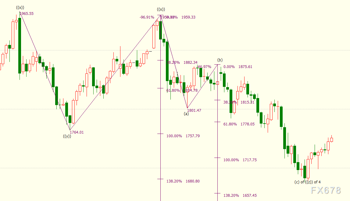 日线上看,iii浪是自1876美元开启的下行(c)浪的子浪,(c)浪是自1959美元开启的下行((z))浪的子浪。((z))隶属于自2075美元开启的4浪调整走势,4浪呈现((w))((x))((y))((x))((z))三重“之”字调整模式。((z))浪料将重新跌破138.2%目标位1681美元,并进一步下探161.8%目标位1633美元。