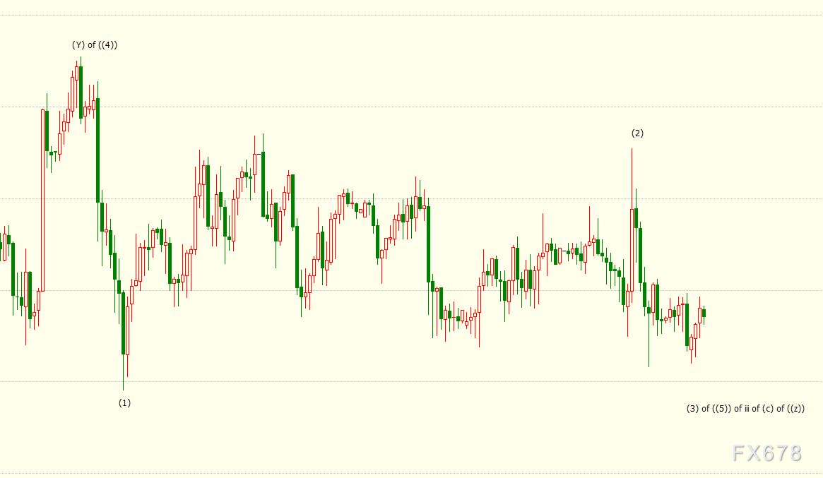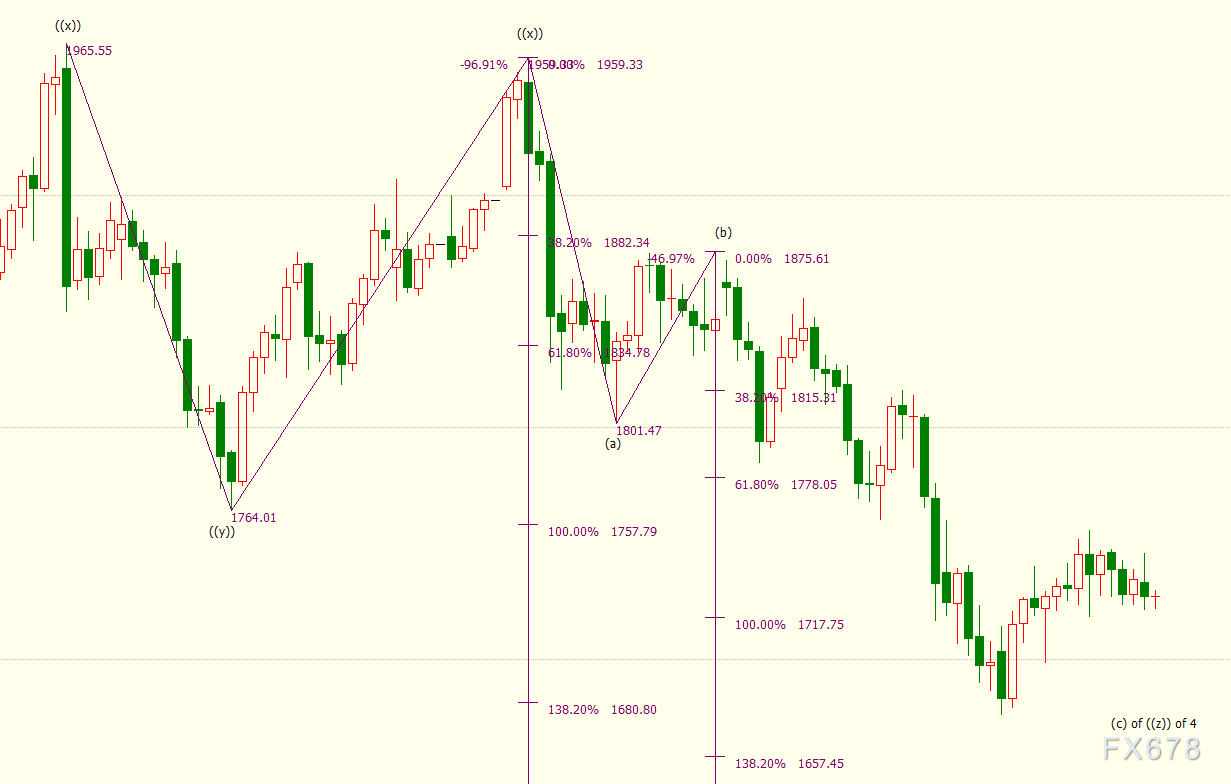 日线上看,iii浪是自1876美元开启的下行(c)浪的子浪,(c)浪的138.2%目标位在1657美元。(c)浪是自1959美元开启的下行((z))浪的子浪。((z))浪的161.8%目标位在1633美元。((z))浪隶属于自2075美元开启的4浪调整走势,4浪呈现((w))((x))((y))((x))((z))三重“之”字调整模式。