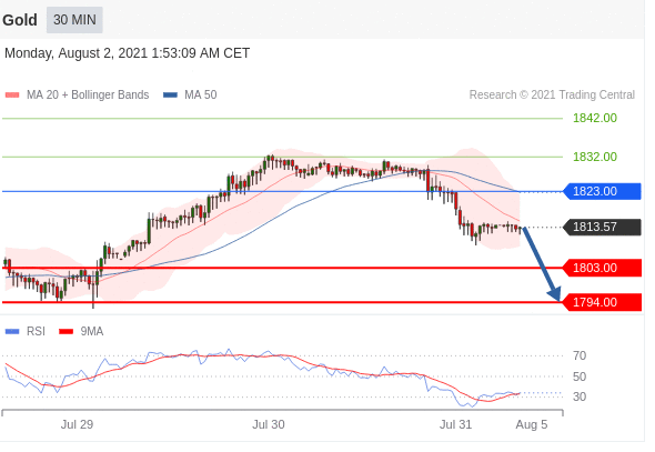交易策略: 在 1823.00 之下,看跌,目标价位为 1803.00 ,然后为 1794.00 。