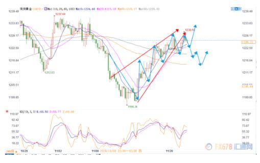 4小时图上,此前认为黄金处于一个下跌楔形中。但是昨日的反弹使得黄金再次持稳于1220美元上方,短时间下行走势减缓。只要不跌破1220美元,可以认为黄金自11月中旬以来进入了上涨通道,黄金将会进一步上行至1240美元附近。