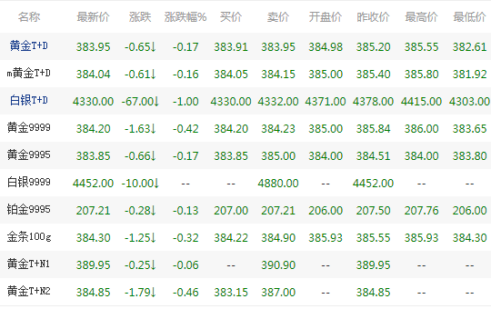 【交易所收盘】 上海黄金交易所黄金T+D9月28日(周三)收盘上涨0.22%报385.3元/克; 上海黄金交易所白银T+D9月28日(周三)收盘下跌2.11%报4267.0元/千克。