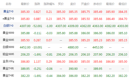 【交易所开盘】 上海黄金交易所黄金T+D9月29日(周四)早盘盘初上涨0.76%报388.67元/克; 上海黄金交易所白银T+D9月29日(周四)早盘盘初上涨1.74%报4385.0元/千克。