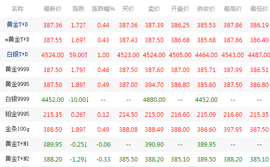 【交易所收盘】 上海黄金交易所黄金T+D9月22日(周四)收盘上涨0.02%报385.5元/克; 上海黄金交易所白银T+D9月22日(周四)收盘上涨1.18%报4464.0元/千克。