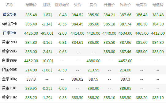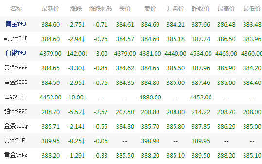 【交易所收盘】 上海黄金交易所黄金T+D9月26日(周一)收盘下跌0.56%报385.2元/克; 上海黄金交易所白银T+D9月26日(周一)收盘下跌3.14%报4379.0元/千克。