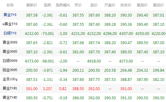 【交易所收盘】 上海黄金交易所黄金T+D8月30日(周二)收盘上涨0.18%报388.6元/克; 上海黄金交易所白银T+D8月30日(周二)收盘下跌0.59%报4235.0元/千克。