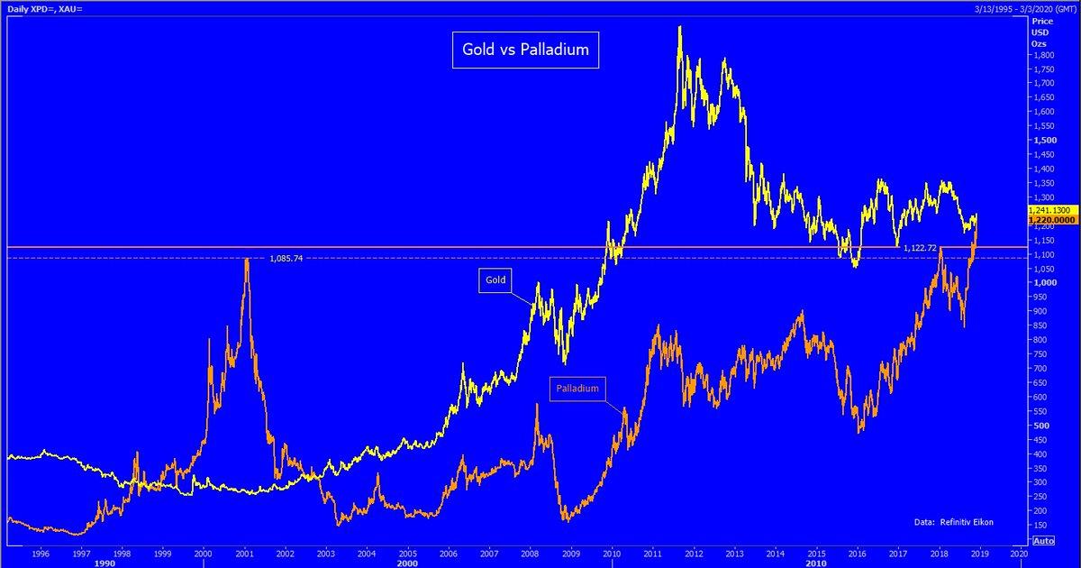 而在贵金属市场上,隔夜最为亮眼的显然并非黄金!现货钯金周二大涨近3%至1239.50美元/盎司,再度刷新历史新高,主要受到市场持续的供应短缺及投机情绪的助推,这是自2002年以来,钯金价格首度在盘中超越金价。