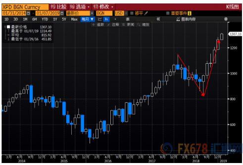 据FX678观察,现货钯金是在8月份开始启动涨势,10月份之后五次刷新历史记录高点,12月份之后出现了三次,而市场多中美贸易局势的担忧降温正是从12月份开始;市场对美联储2019年加息预期降温,也是在12月份达到高峰,美元指数12月份下跌了1.09%,也是2018年1月份以来最差月度表现。