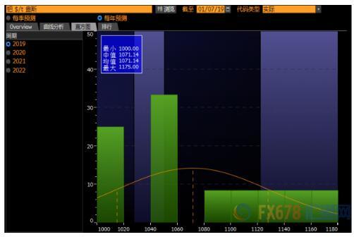 从各个季度来看,金融机构对现货钯金的预测也比较悲观,第一到第四季度预测值的均值分别是1049.55、1047.73、1062.78、1074.38,与当前价格也相差将近20%。