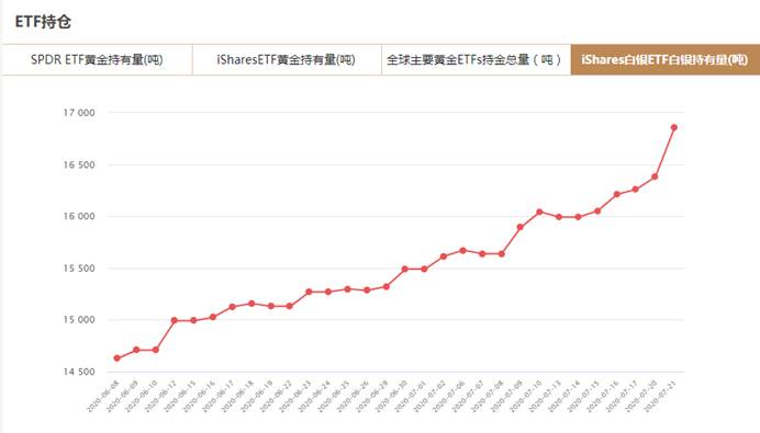 iShares白银ETF7月21日白银持有量为16857.08吨,与上一交易日增加478吨。