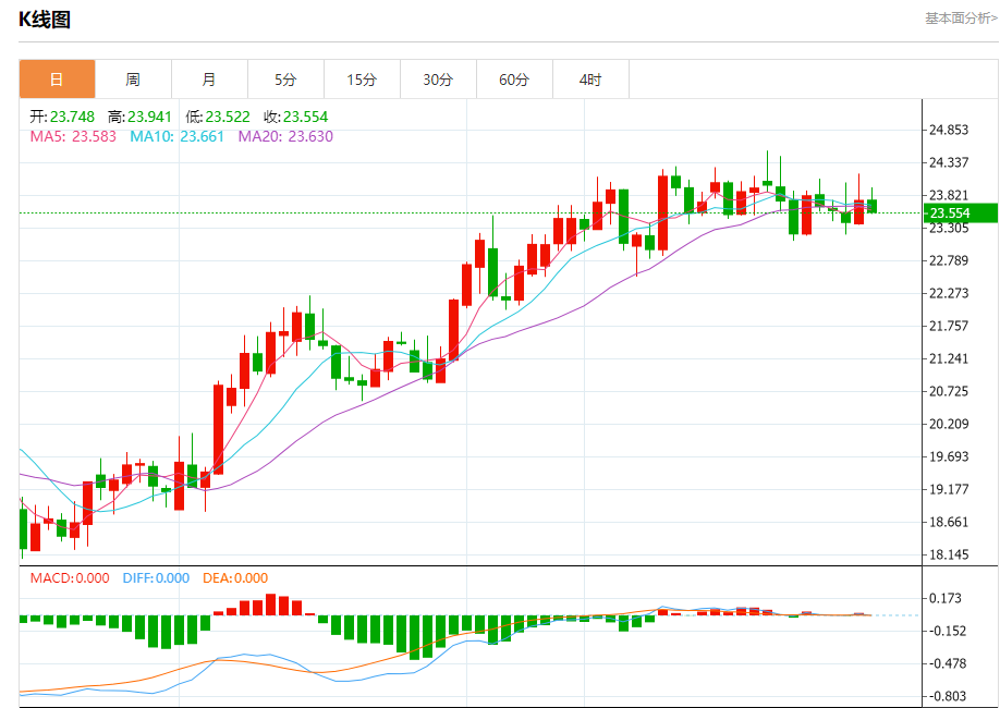 周五盘中,现货白银报23.560,跌幅0.80%。