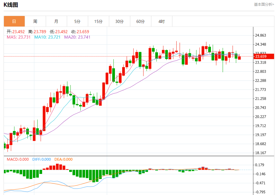 周一盘中,现货白银报23.701,涨幅0.51%。