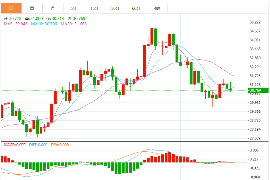 今天的预期交易区间:在30.70美元支撑位和31.63美元阻力位之间。