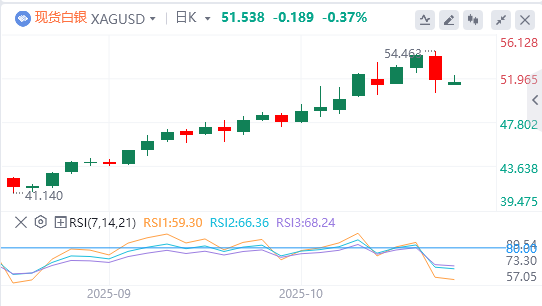 白银价格从周五公布的54.50美元左右的历史高点回撤。然而,随着20天指数移动平均线(EMA)走高,近期趋势仍然看涨,交易价格约为49.00美元。