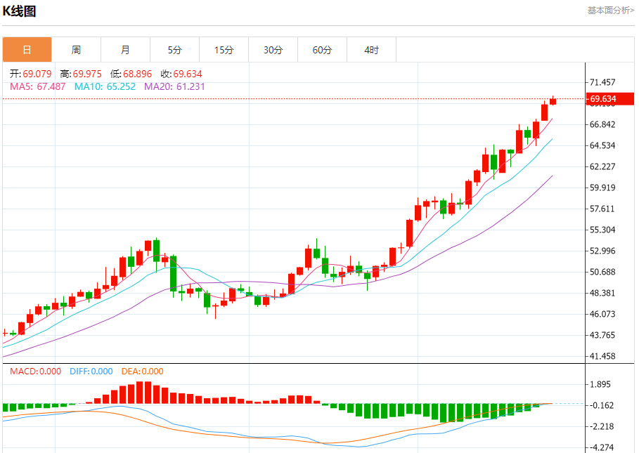周二盘中,现货白银报69.629,涨幅0.87%。
