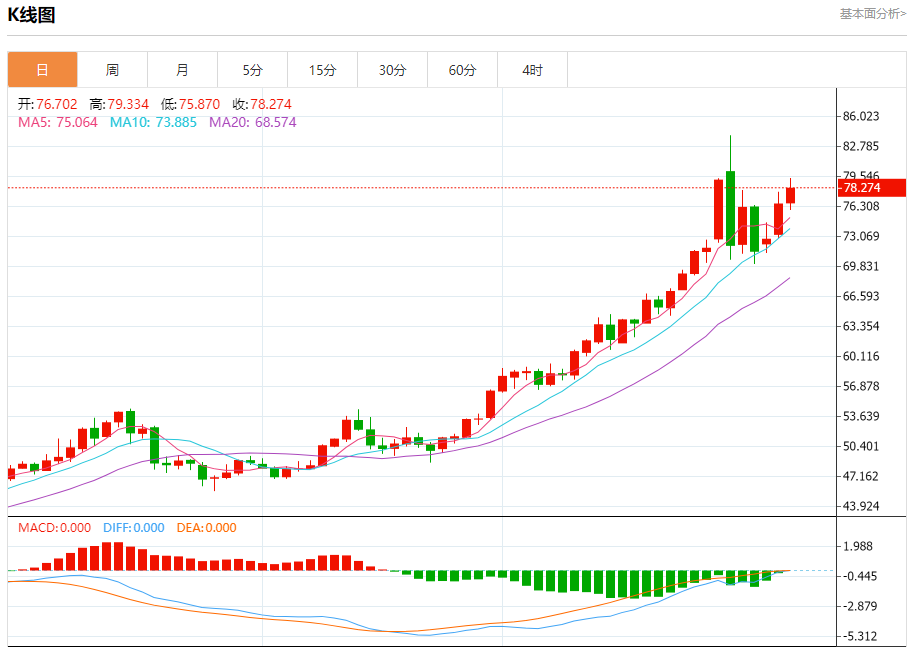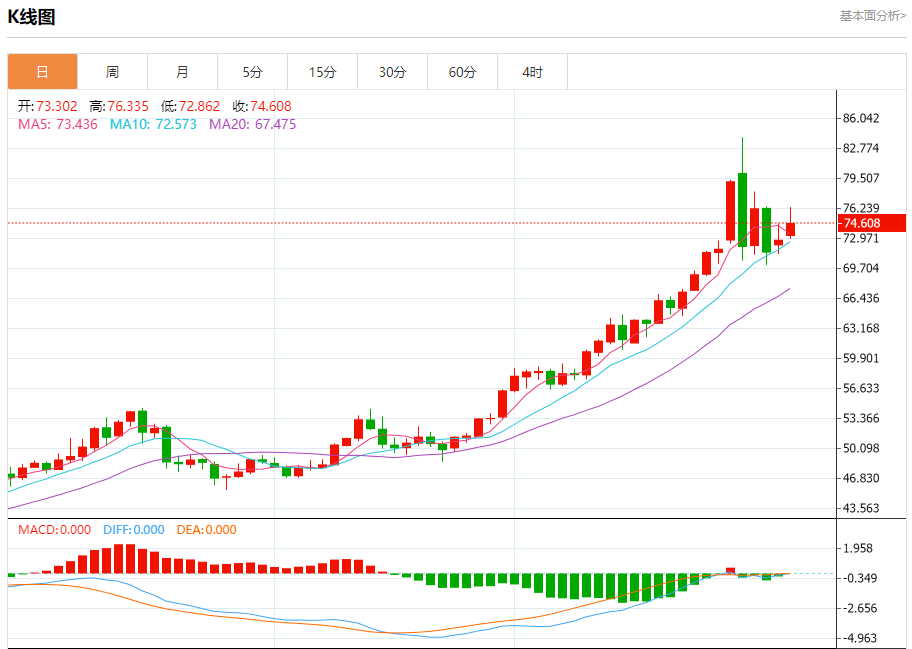 周一盘中,现货白银报74.606,涨幅2.50%。