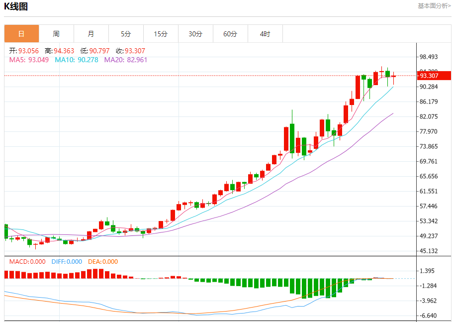 周四盘中,现货白银报93.260,涨幅0.19%。