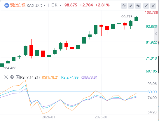 若价格回调,初始需求可能出现在9日均线92.42美元附近。日收盘跌破短期均线,将面临向上通道下限约82.00美元调整的风险。进一步下跌将对白银价格施加下行压力,需在50日均线73.14美元附近徘徊。