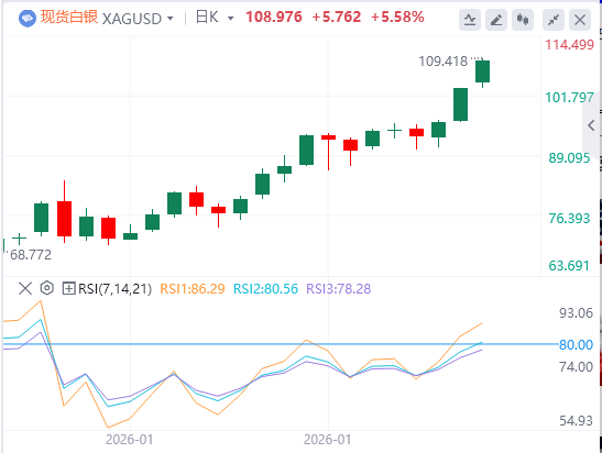 白银价格仍稳居上升中的50日指数移动平均线(EMA)之上,且两者均有明显溢价。短期趋势加剧,凸显趋势加速。随着9日和50日均线间的利差扩大,趋势结构保持不变,尽管前者趋于平稳将预示动力减弱。