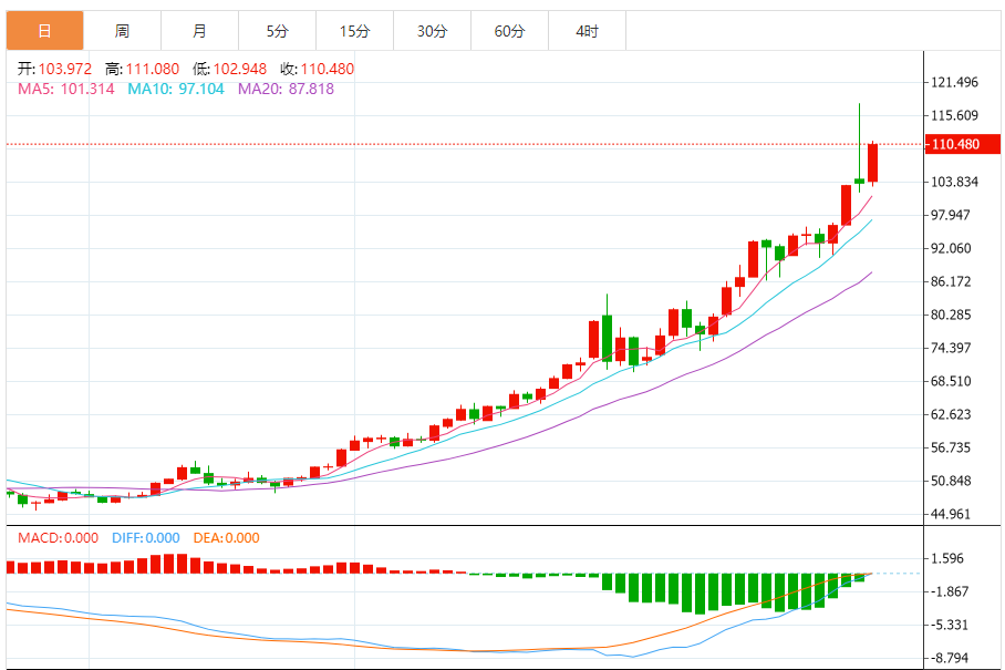 周二(1月27日),现货白银目前位于110.455美元/盎司附近,涨幅为6.56%。