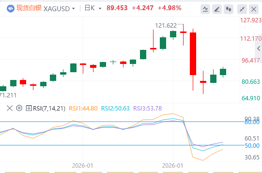 白银较前一天上涨,在从生涯高点121.61美元下跌超过30%后回升。在美国总统唐纳德·特朗普提名凯文·沃什接替美联储主席杰罗姆·鲍威尔后,银价呈垂直调整。