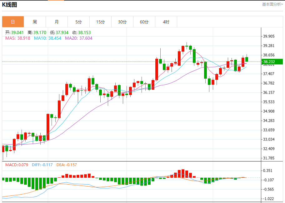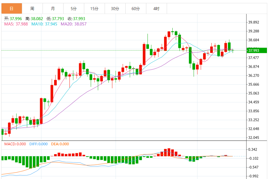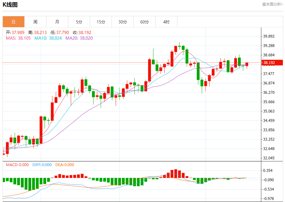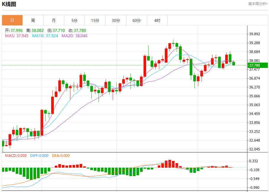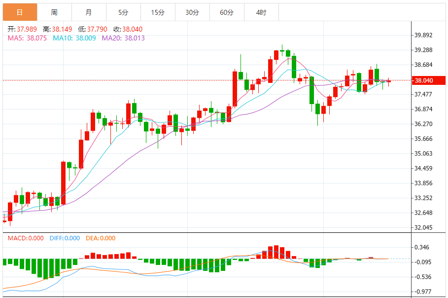 周四亚盘,白银(白银/美元)在周四亚洲时段稍微回落,距离近三周高点仅一步之遥,目前交易价格略高于38.00美元中间水平,日内上涨约0.10%。美元(UD)从两周多以来的最低水平小幅反弹,成为对以美元计价商品的主要阻力因素。 从技术角度来看,回调可能归因于1小时图上相对强弱指数(RI)略显超买的情况下出现的获利