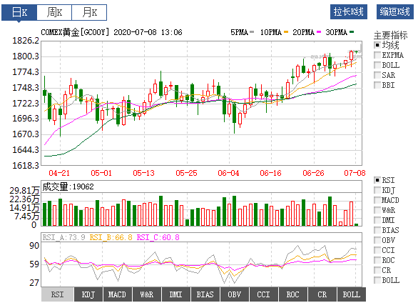 现货黄金周二收于1794.28美元/盎司,上涨10.09美元或0.57%,金价盘中飙升至2011年11月以来最高水平1797.20美元/盎司,距离1800美元/盎司心理关口仅几美元之遥。