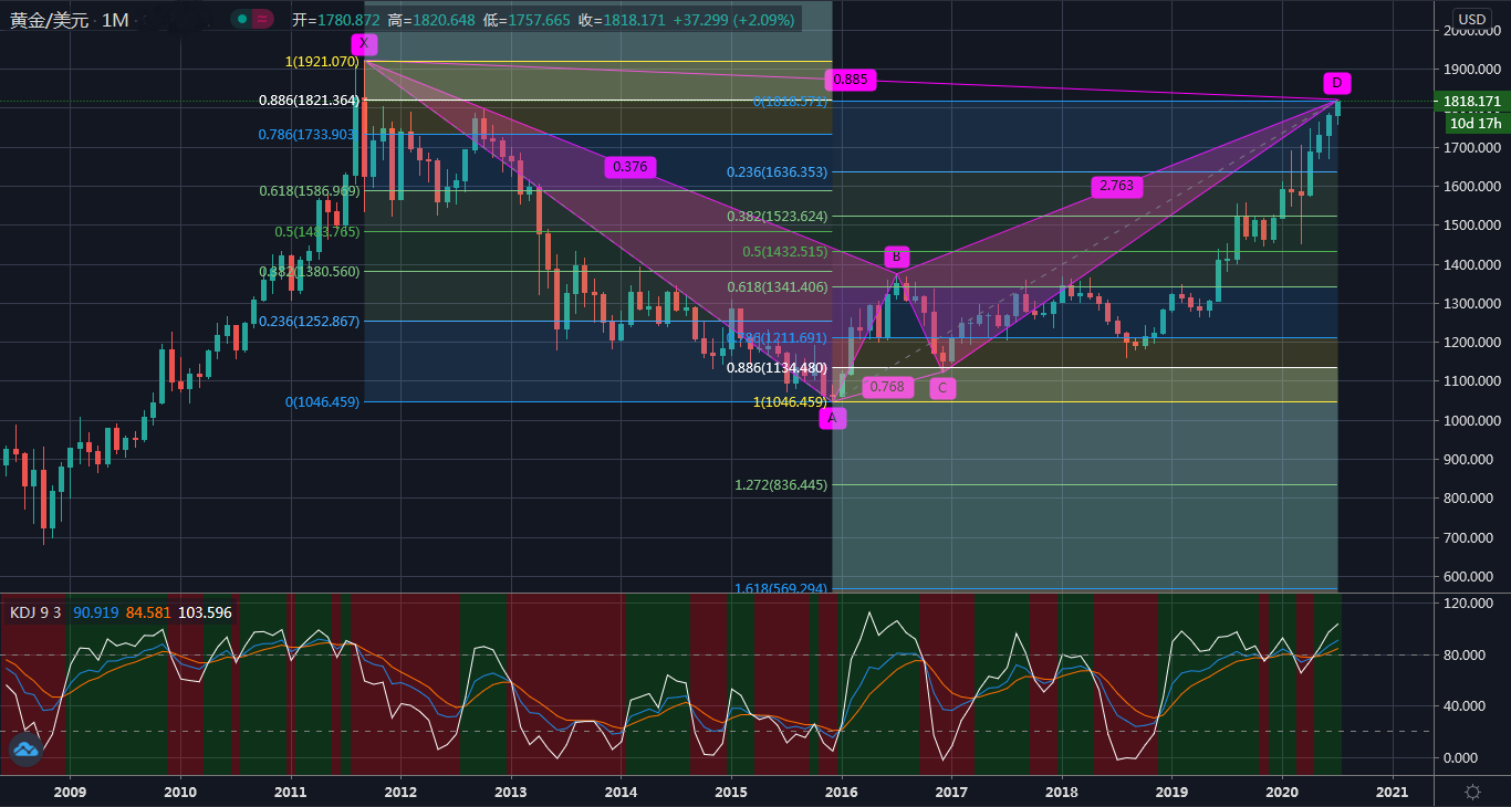 如升破并企稳1821水平,则上述看跌蝙蝠并失效,多头有望向历史高点1921发起冲击。