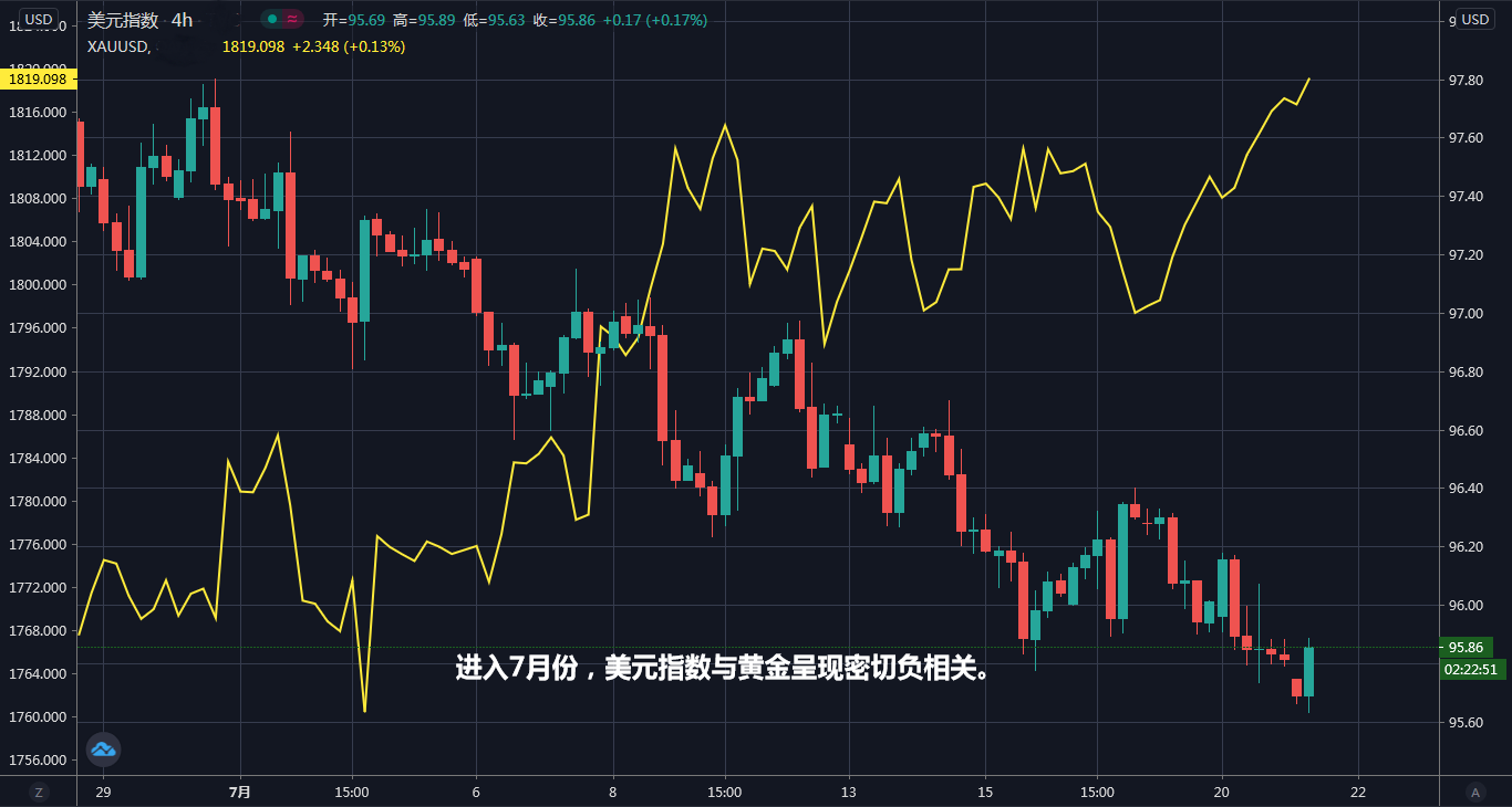 与此同时,美元指数则备受打压,至周二(7月21日)亚市早盘最低下探95.66,刷新近6周最低。而随着美元指数的承压,黄金短线节节攀升,周一最高触及1820.6,再创近9年新高。