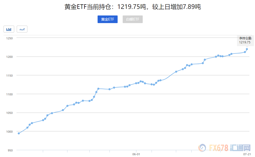 7月22日黄金ETFs数据显示,截止7月21日全球最大的黄金ETF-SPDR Gold Trust的黄金持仓量1219.75吨,较上一交易日增加7.89吨,逼近1220吨,续刷逾7年高位。