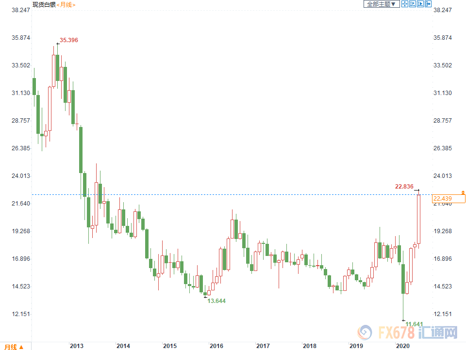 周二现货白银近四年来首度突破20美元关口,并维持飙升的态势,继周二飙升7%后,周三亚盘时间现货白银一度上涨7%,盘中最高触及22.836美元,为近7年高位。