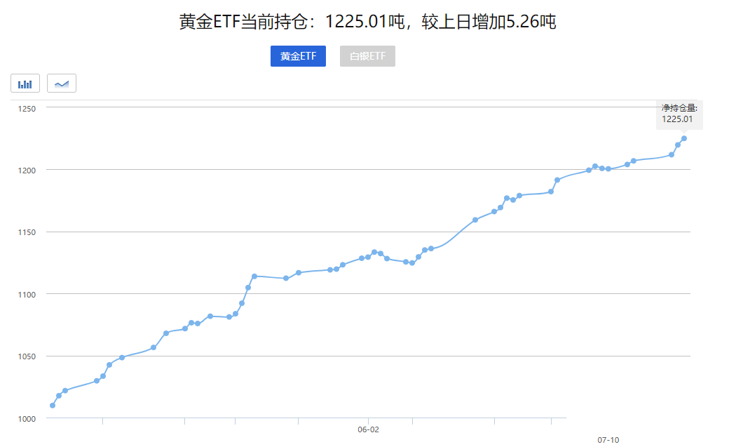 7月23日黄金ETFs数据显示,截止7月22日全球最大的黄金ETF-SPDR Gold Trust的黄金持仓量1225.01吨,较上一交易日增加5.26吨。