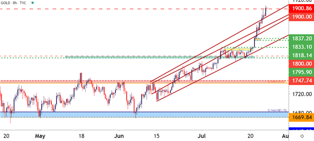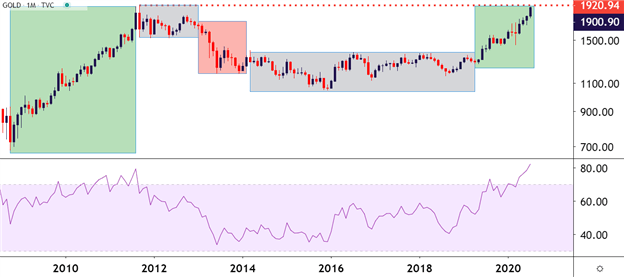 不过金价开启下一轮看涨走势并没有耗费太久,几周之后多头进场使得金价录得了一些更高的低点支撑。自那之后金价便一直处在大幅看涨行情当中。