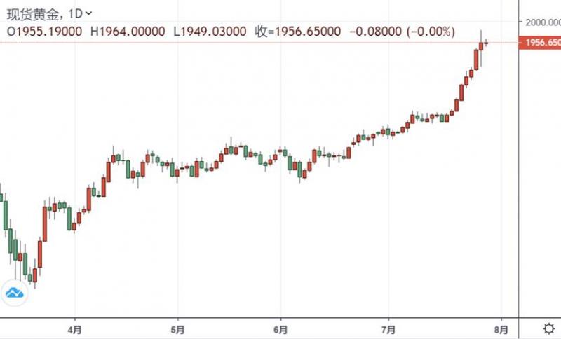 黄金眼下也在静候美联储决议。金价目前徘徊在1960附近,昨日金价一度刷新历史高点至1980美元上方,随后遭一波杀跌,一度下挫至1906低点,不过尾盘依旧收涨。